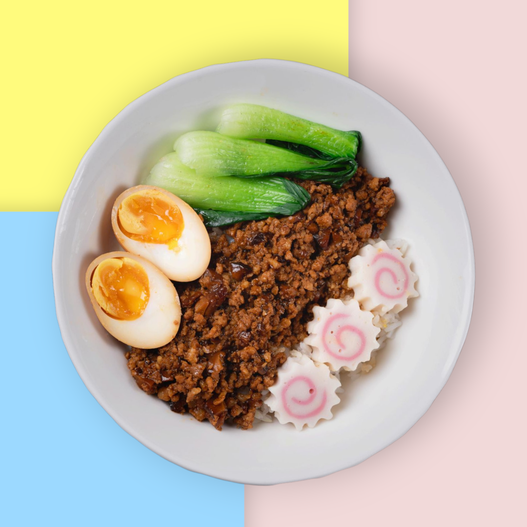 Ciotola di riso bianco con ragu di suino, uova marinato verdure naruto